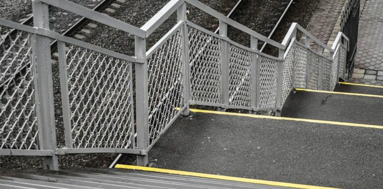 alt: Stairs with metal railing beside train tracks