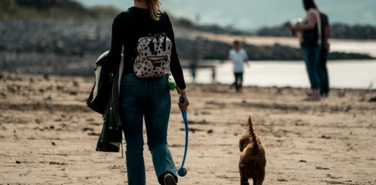 Alt: Woman in black long sleeve shirt and blue denim jeans holding dog leash walking on beach