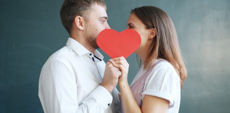 alt: Couple holding red heart obscuring faces